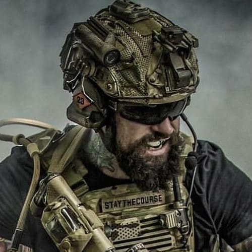 A man in military gear with a helmet on.
